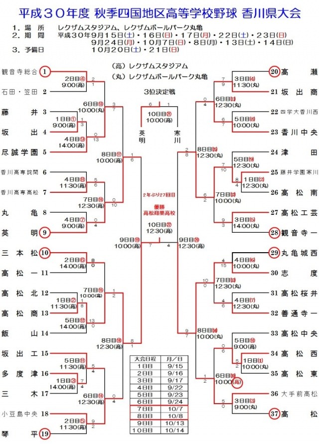 | 香川中央 | 1 | 1 | 0 | 0 | 1 | 0 | 0 | 1 | × | 4 |