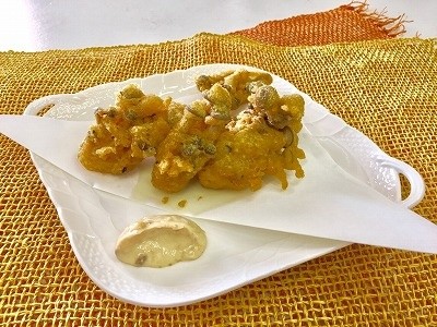 ④③にベニエ生地をつけて、170℃の油でサクッとするまで揚げる。