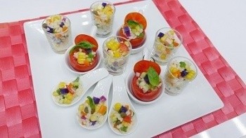 【トウモロコシとお米のサラダ】 米 50g トウモロコシ 1/2本 ロースハム 2枚 スライスチーズ 2枚 Ⓐ ピクルス 大1 バジル 2枚 ミニトマト 4個 好みの野菜 適量 塩・胡椒 適量 Ⓑ ヴァージンオリーブオイル 適量 ヴィネガー 適量 ① 米は茹でる又は炊いたものを軽く水洗いする。 ② トウモロコシは茹でるか蒸してほぐす。 ③ Ⓐの材料を角切りにしⒷで味付けする。 ④ ①②③とバジルを和える。