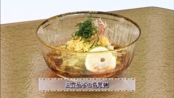 【三豊茄子の翡翠麺】 (材料) 三豊茄子1本 茗荷 1本 大葉 1枚 青柚子又はすだち 1個 おろし生姜 適量 錦糸玉子 適量 片栗粉 適量 麺つゆ 適量 (作り方) ①三豊茄子は皮を剥き、細長く切り水に漬け灰汁を出す。 ②水から上げた三豊茄子を拭き取り片栗粉をまぶす。 ③熱湯にて2~3分茹で水にさらす。 ④水を切り器に盛り付け薬味を添え麺つゆを脇から入れ仕上げる。