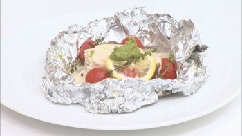 ②アルミホイルにレンコンのスライス、オリーブハマチ、湯剥きしたミニトマト、