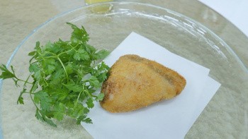 2 1のカツオの水分を拭き取り、小麦粉・卵・パン粉の順で衣をつける。
