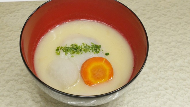 【あん餅雑煮】4人分 あん入り餅 4個 大根 50g 金時人参 50g 里芋 4個 出汁 600ml 白味噌 100g 青のり 適量 調理手順 ①大根、金時人参は丸くむき下茹でする。里芋も皮をむき輪切りにし下茹でする。 ②出汁に味噌を溶き、鍋を温めていく。 ③あん入り餅は、別の鍋にお湯を入れて柔らかく戻しておく。 ④出汁が温かくなれば野菜をいれる。 ⑤全ての食材が温まればお椀に里芋を敷き、餅、大根、人参を盛り付け汁を張る。 ⑥最後に青のりを振り仕上げる。
