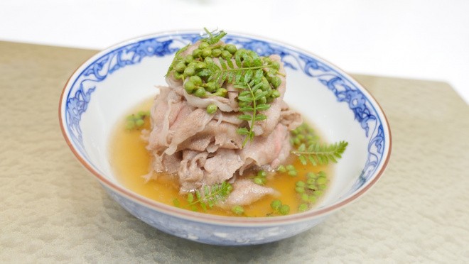 【実山椒とオリーブ牛のしゃぶしゃぶ】 材料 オリーブ牛ロース肉(しゃぶしゃぶ用) 300g 実山椒 適量 出汁 750ml 薄口醬油 50ml みりん 50ml 作り方 ①実山椒は枝からちぎって5分ゆで、水に2時間程度さらしておく ②鍋に出汁を沸かし、①の実山椒と肉を入れ、しゃぶしゃぶ程度に火を入れる ③器に実山椒とオリーブ牛のしゃぶしゃぶを盛り付け、出汁を合わせ入れる