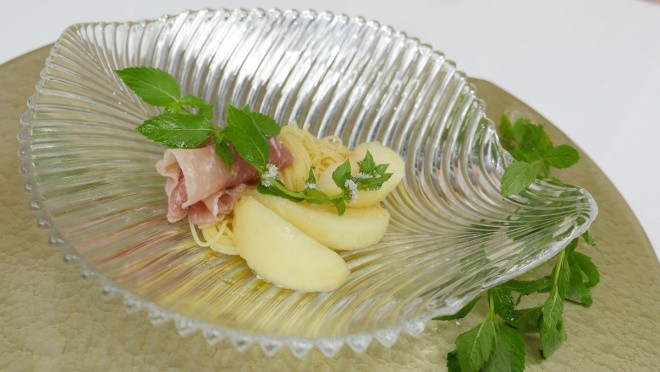 ④お皿にパスタを盛り、調味料と合わせておいた桃をかけ、