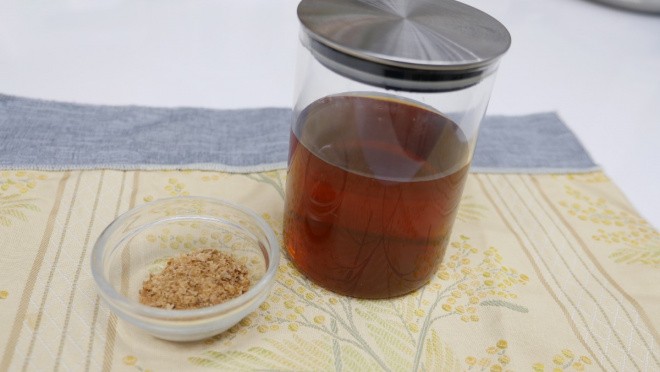 ○布(ペーパー)で漉しして、瓶などに入れ、冷蔵庫で保管。(二週間程度は持ちます)