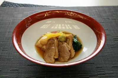 薄力粉をまぶした鴨、紅葉麩、ほうれん草、出汁で溶いた山葵を入れて1分位炊く。