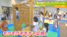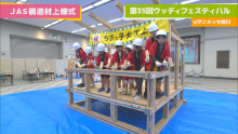 子どもたちが気軽に木に触れることができる「モクモクおもちゃ広場」や「JAS構造材上棟式」「丸太切り競争」、
