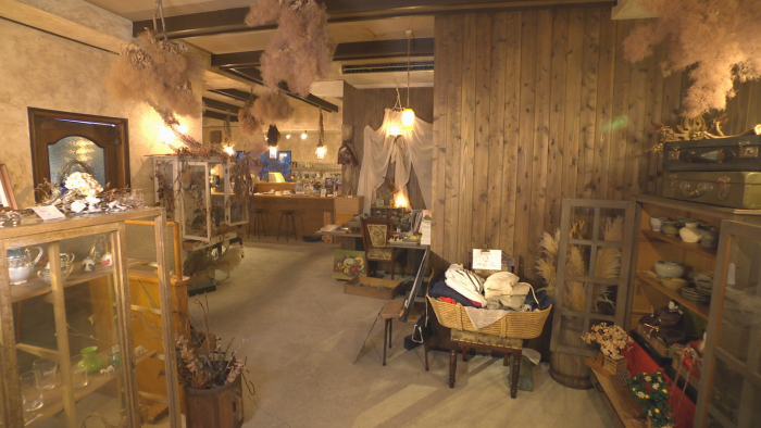 店内はアンティークの家具やドライフラワーに囲まれたおしゃれで落ち着いた空間です。