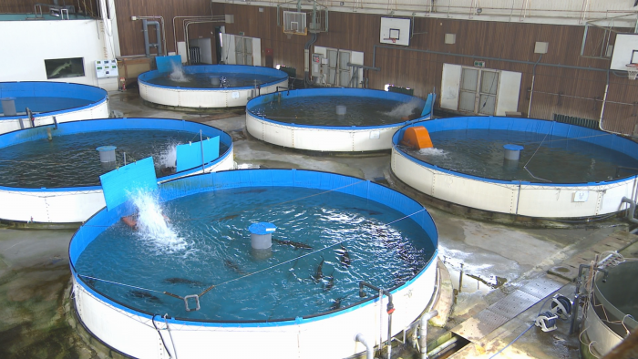 こちらでは体育館でチョウザメ養殖を行っているんです!