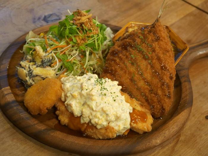 チキン南蛮に大きなアジフライ、グラタン、サラダなどなど…とにかく腹がパンパンになるボリューム満点メニューです!