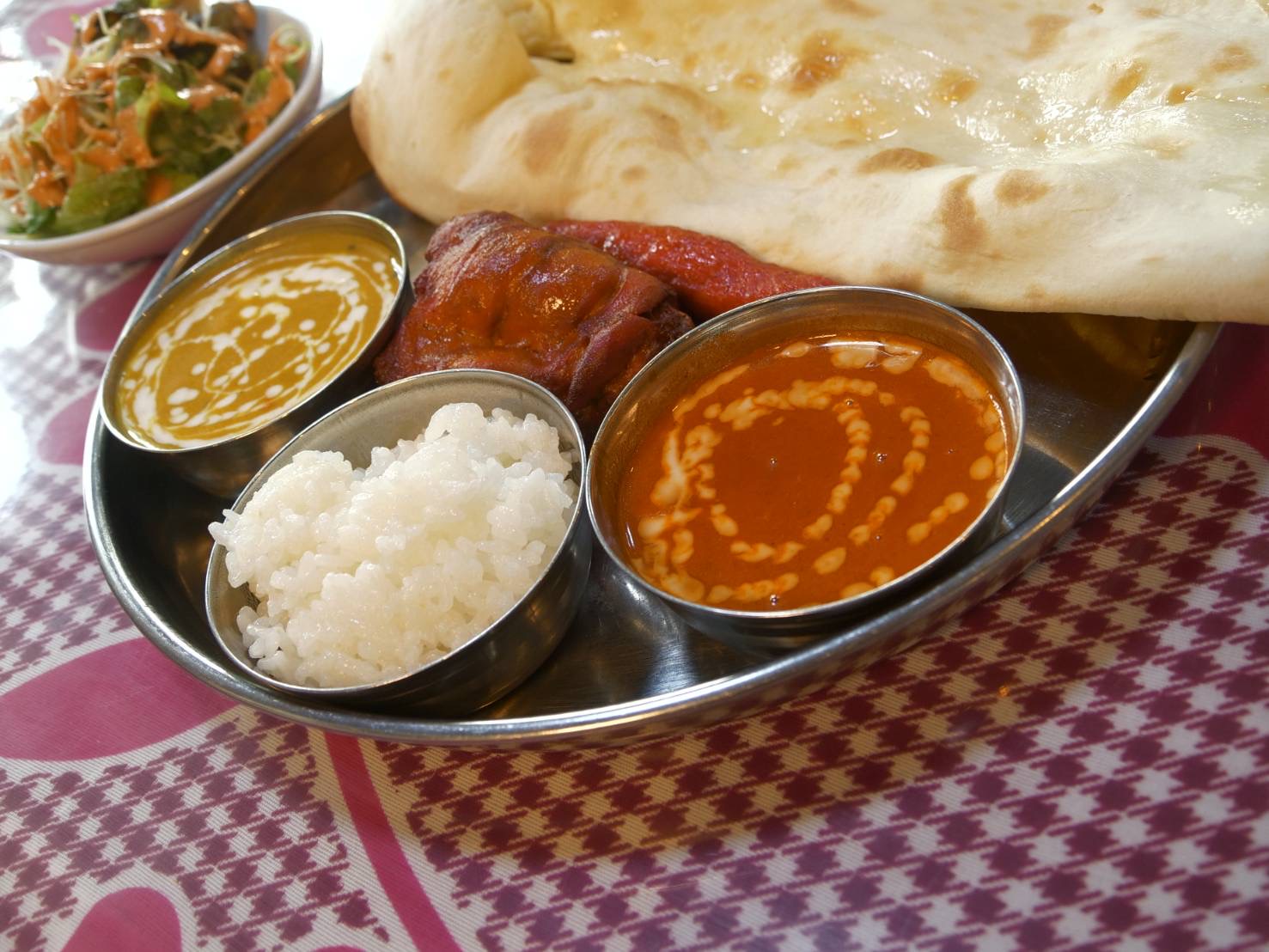 いろいろあるセットの中から、2種類のカレーにタンドリーチキン、シシカバブ、ライス、ナンがセットになった