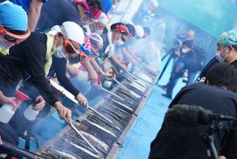 目黒川から程近い会場で1500匹のさんまを豪快に焼く光景は圧巻!