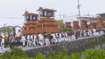 「だんじり」と呼ばれる屋台や「みこし」合わせて80台余りが市内を練り歩く豪華絢爛なお祭りです。
