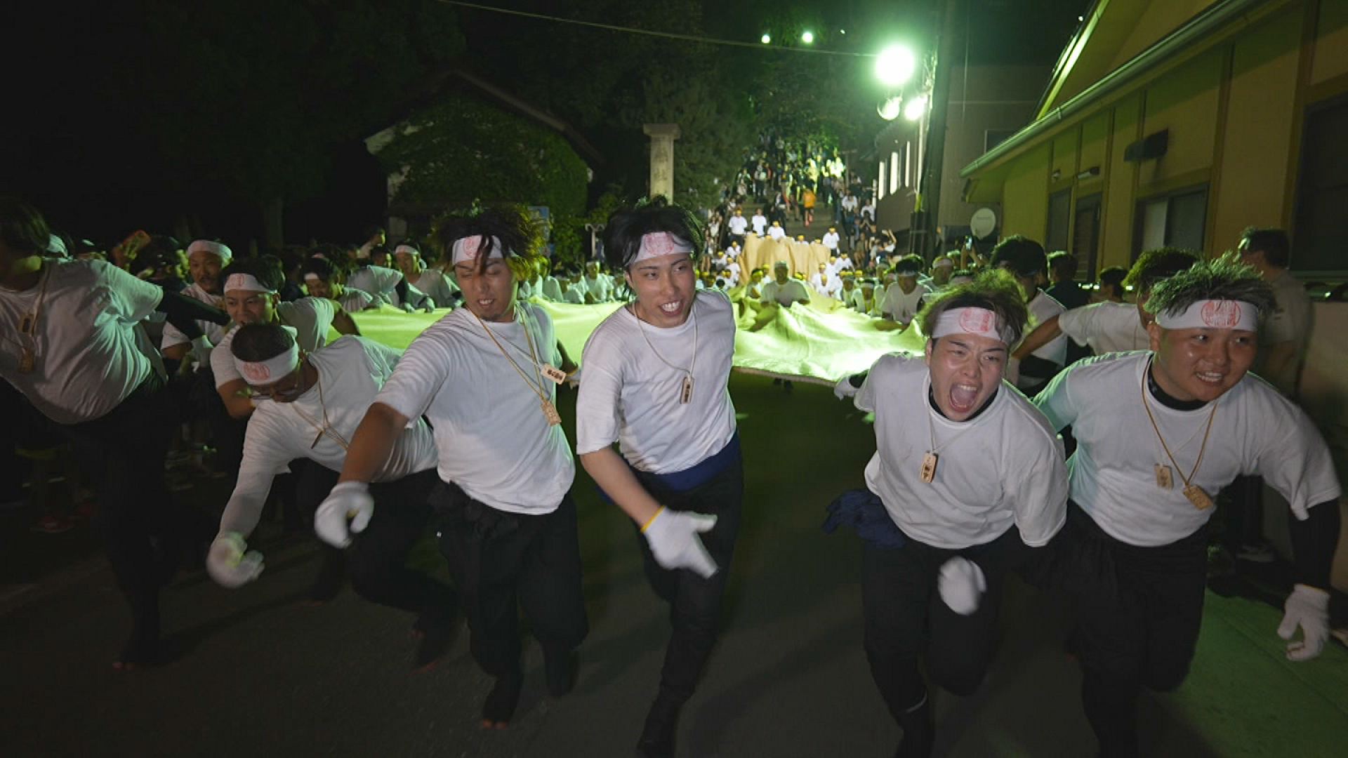 大提灯を町一体で掲げ、提灯の灯とともに祭りを未来へ繋ぐ人々を伝えます。