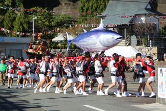 海に感謝を捧げる秋季祭礼では、宵祭の魂迎式、13基の曳山巡行、築山行事などが行われ、