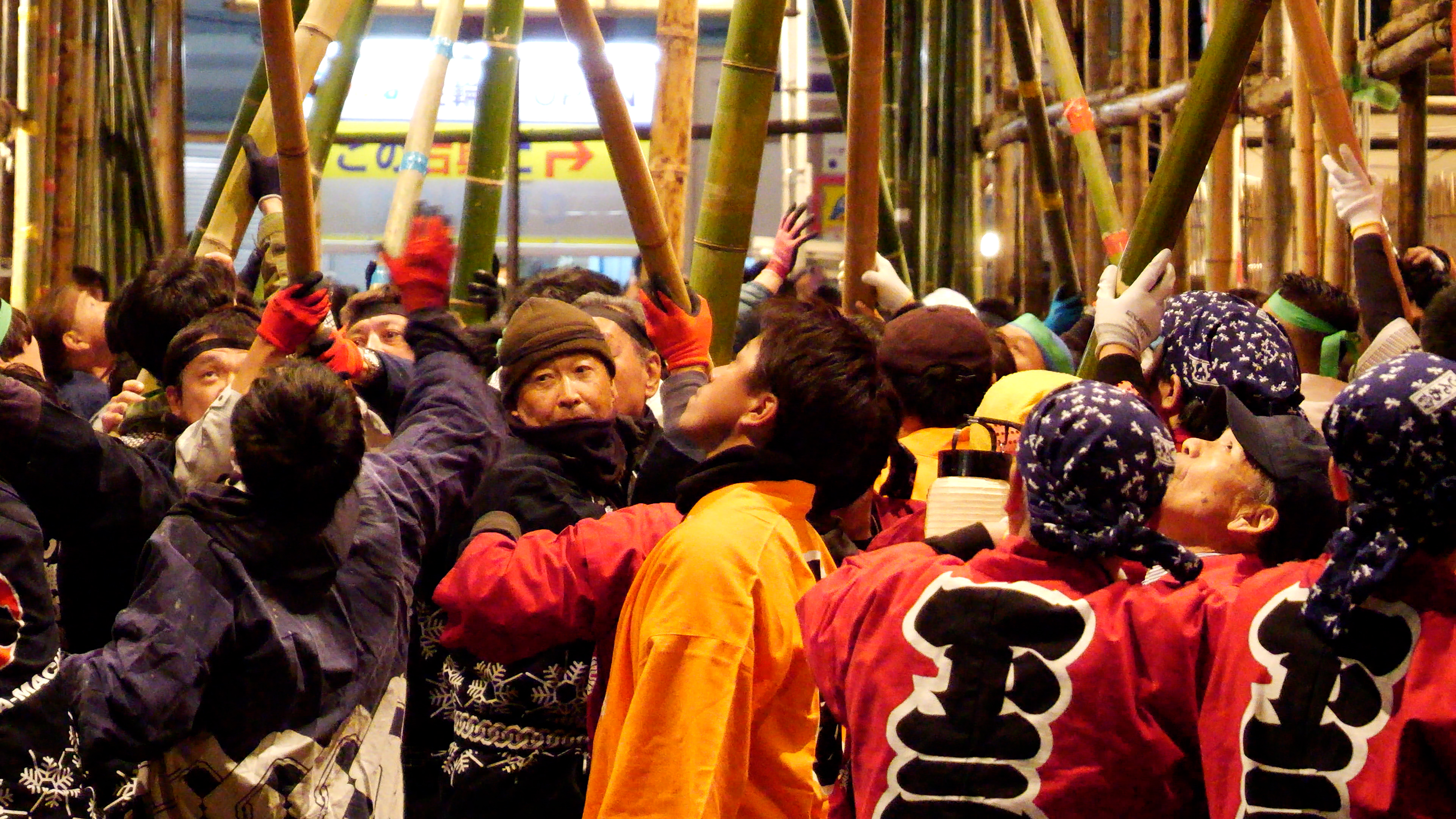 現在では、高さ約10メートルの矢来を設置し、各団体がぶつかり合いながら竹竿を激しく揉み合う祭りとなっています。