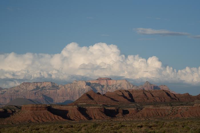 そびえ立つ赤い岩壁と澄んだ青空が見事なコントラストを描くザイオン国立公園。