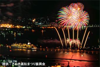 今年は6000発の花火が高松の夜空を華やかに彩ります。 まつりのクライマックスは総おどり。