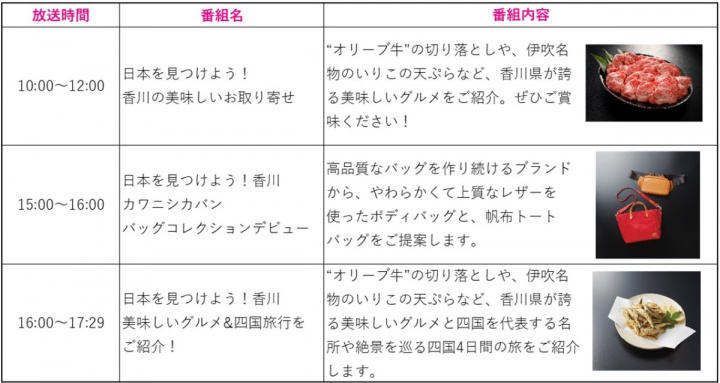 株式会社ケーブルメディア四国では、ショッピング専門チャンネル「SHOP CHANNEL」(以下、ショップチャンネル)を運営するジュピターショップチャンネル株式会社及び香川県と連携して、香川県産品と旅行商品を特集する4時間30分の生中継テレビ通販番組「日本を見つけよう~香川~」を生中継で放送します。